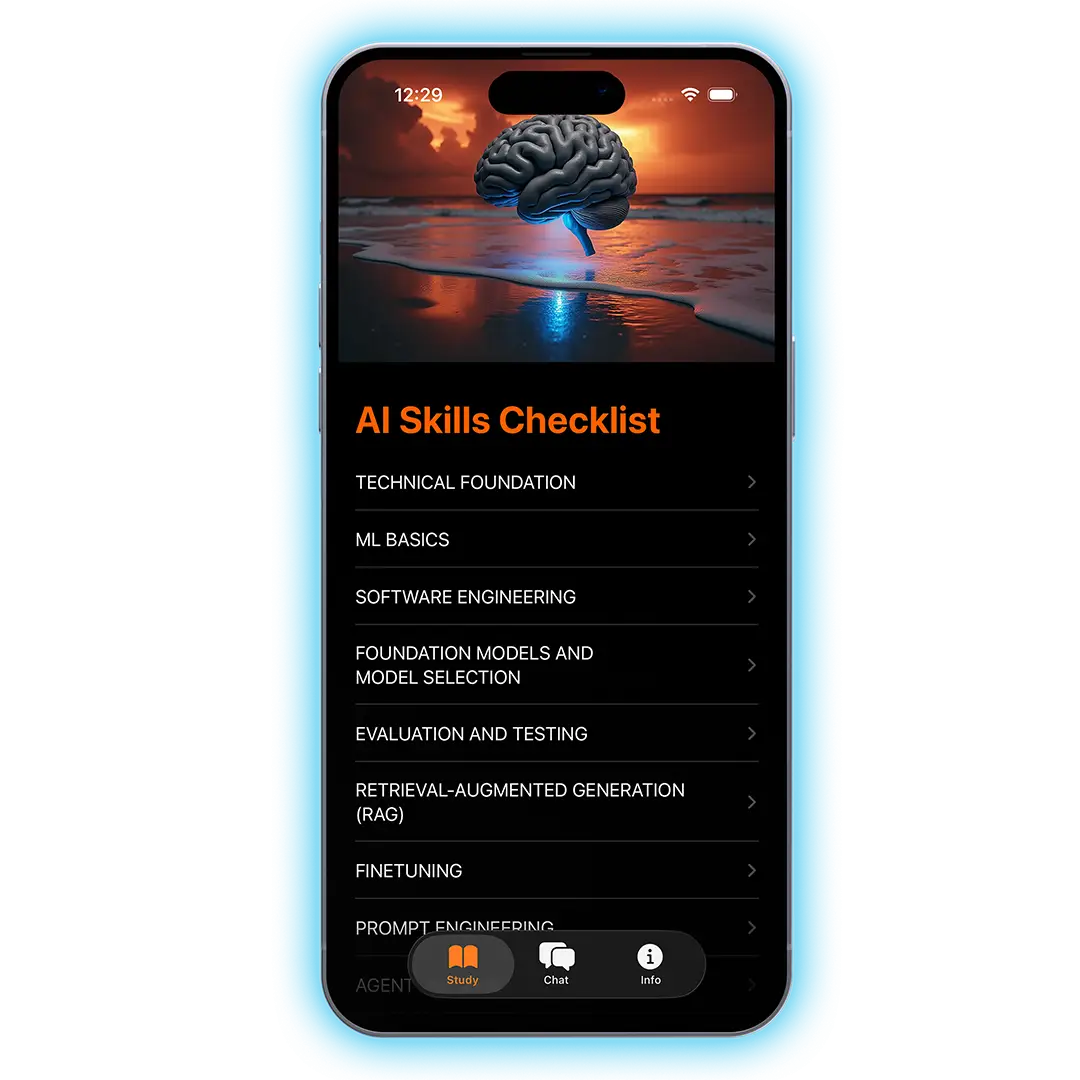 Based on these checklist pages, I then moved to create an open source iOS skills app (which users could use to study the material) along with a RAG-based chat feature which users could use to surface specific material related to AI Engineering. (Check out that repository below).
