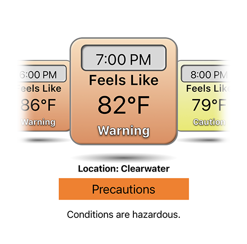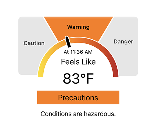 This interactive UI element allowed the user to not only see the maximum threat, but to see how the heat index will change throughout the day so they might plan their day accordingly.
